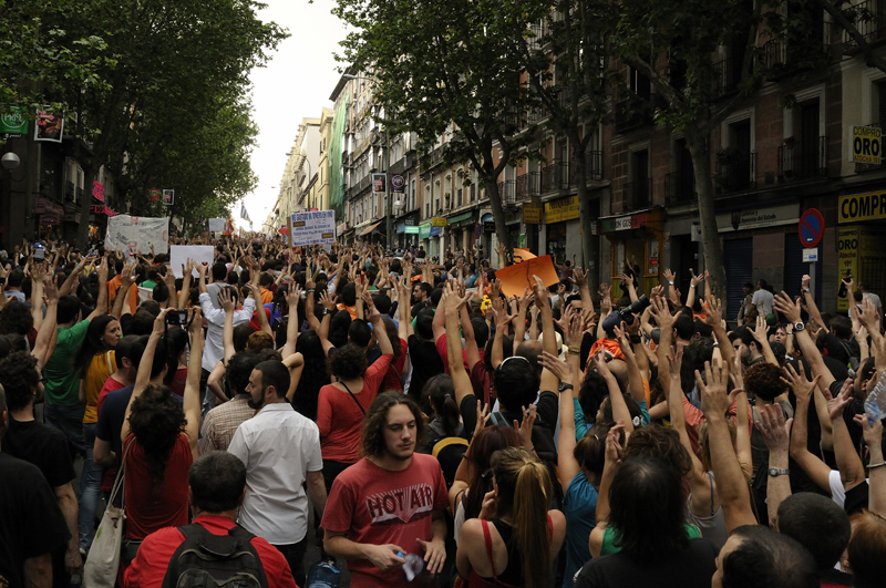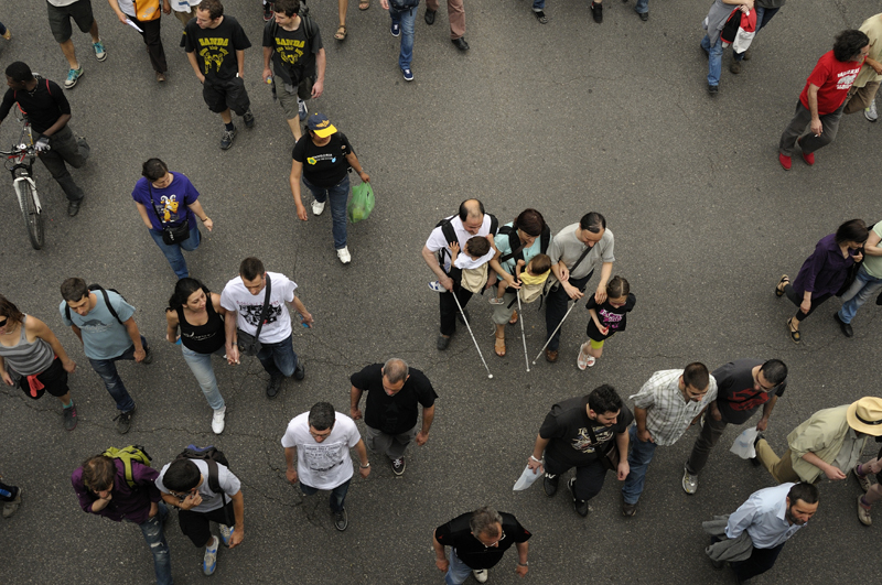 12 de mayo, Madrid. Un grupo de no videntes es guiado por una ninia en la manifestación anticapitalista. De todas parte de la ciudad se encuentran grupos en la calle principal y siguen su camino hacia el centro. Hasta horas de la madrugada una cantidad innumerable de personas permanecen, sin hacer caso a las restricciones policiales, en la Plaza del Sol. Personas mayores y jovenes, con bronca y preocupados, sencillas y complicadas, llenas de fantasía y pragmáticos. Todos ellos y más le envian al mundo un ejemplo y un mensaje, ante el cuál ningún ser humano sincero puede seguir cerrando los ojos: „El problema no es la crisis, sinó el sistema!“ Estoy casi seguro que el grupo de no videntes se encontraban allí en medio de toda esa gente.