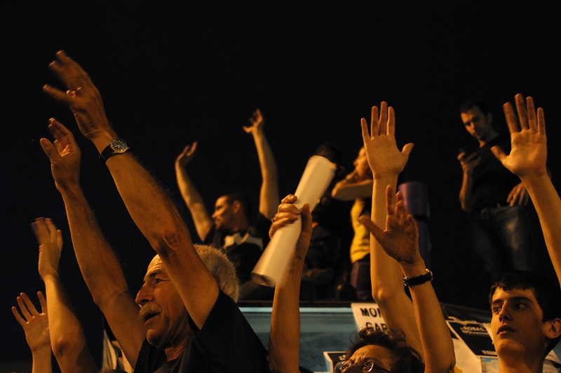 Bis in die tiefe Nacht hielt eine riesige Menschenmenge gegen alle Polizeiauflagen den Plaza del Sol und die umliegenden Strassen besetzt. Alte und Junge, Wütende und Besorgte, Einfache und Komplizierte, Phantasten und Pragmaten gaben dort wieder einmal der Welt ein Beispiel und eine Botschaft, vor denen kein redlicher Mensch mehr die Augen verschließen kann: „Das Problem ist nicht die Krise – es ist das System!“ Ich bin mir fast sicher, dass sich auch diese Gruppe von Blinden bis zum Schluss  in der dichtgedrängten Menge befand.