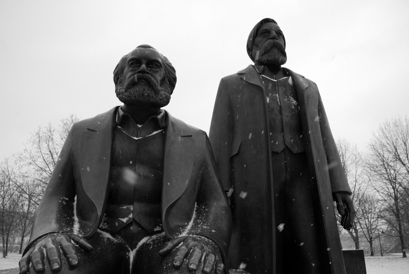 Karl: „Sie sagen, wir haben uns geirrt, Friedrich. Ein grober Unfug ist das. Geirrt? Haben wir etwa im Politbüro gesessen? Haben wir die Kosaken erschossen? Konnten wir eingreifen, als sie uns zur Religion erhoben? Hat auch nur irgendwer versucht, uns zu entwickeln und aufzugreifen, was wir als Menschen hinterließen, unsere Aufforderungen zum Denken, zum Fragen, zum Zweifeln? Geglaubt haben sie uns, Friedrich. Was für eine Beleidigung für dich und mich! Geglaubt. Was für eine Bequemlichkeit! Sie haben uns geglaubt wie man an einen gottverdammten Katechismus auf dem Nachttisch glaubt. Sie flogen zum Mond, aber Du und ich sind nur noch welke Rosenkränze in einer Zeit der Verwirrung. Ich könnte dermaßen kotzen. Man hätte ihnen einen Kant in jedes Vorwort des Kapitals legen müssen, als Magenbitter für die schwere Kost im Hauptgang. Geirrt? Diese Armleuchter. Aufregen tut mich das! Was machen wir überhaupt hier? Was soll all dieser Schnee? Ich sehe den verdammten Turm nicht mehr.“